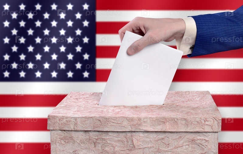 Мужчина бросает бюллетени в урну для голосования на фоне американского флага