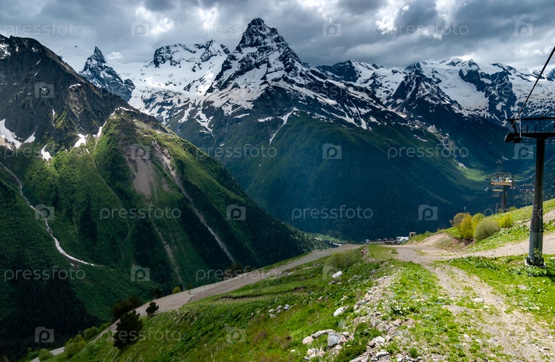 Дорога идет вдоль опор канатной дороги, внизу виден поселок Домбай. Кавказские горы, Россия