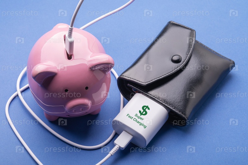 Копилка, кошелек и зарядное устройство для смартфона на синем фоне, концепция на тему зарабатывания денег