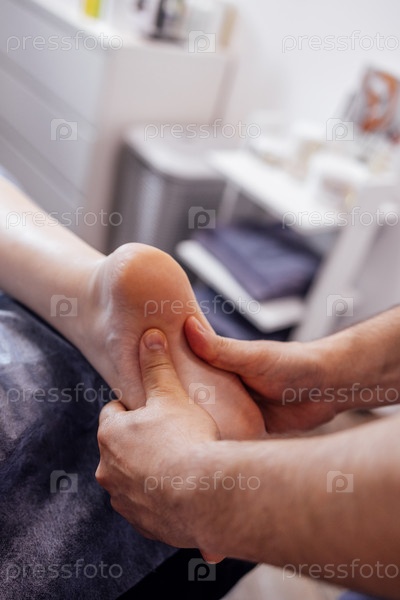 Крупный план женской стопы, получающей нежный массаж. Массажистка держит женскую ногу в руках. Молодой клиент лежит и наслаждается расслабляющей процедурой в салоне красоты. Санаторно-курортное лечение. Вы и уход за кожей. Копировать пространство