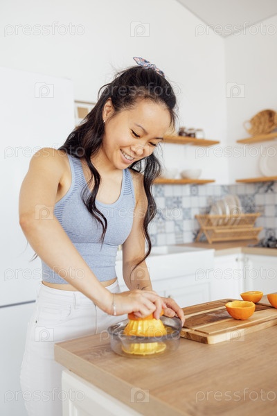 Привлекательная улыбающаяся азиатка готовит на кухне свежий вкусный и полезный апельсиновый сок. Красивая молодая кореянка выжимает апельсин на ручной соковыжималке