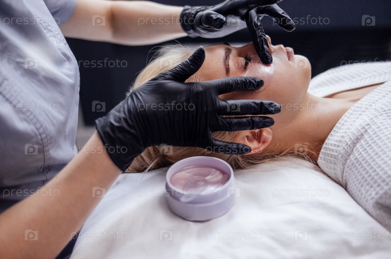 Крупный план мастера, накладывающего силиконовые пластыри под глаза симпатичной клиентки-блондинки