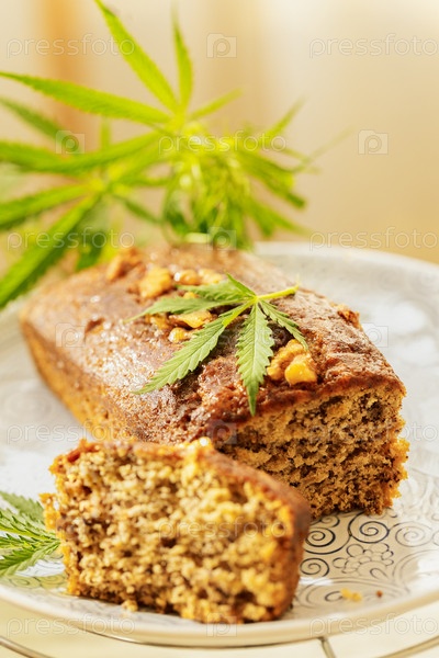 Свежеиспеченный вкусный хлеб с добавлением конопли, украшенный листьями конопли
