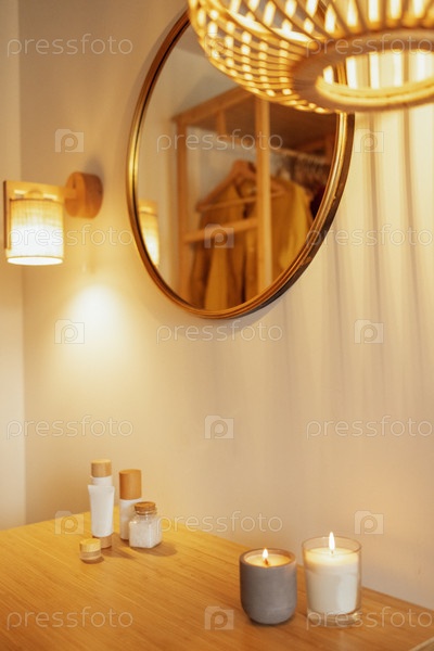 Две зажженные свечи в керамическом и стеклянном подсвечнике на деревянном столе