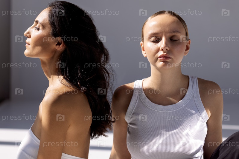 Красота портрета двух привлекательных молодых женщин с чистой здоровой кожей и волосами. Очаровательные модели с естественным макияжем на сером изолированном фоне. Косметология и спа-процедуры. Концепция ухода за кожей