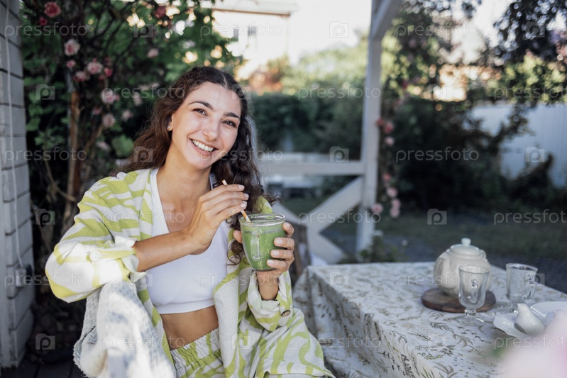 Привлекательная кудрявая девушка в белом топе улыбается и пьет зеленый коктейль из прозрачного стекла