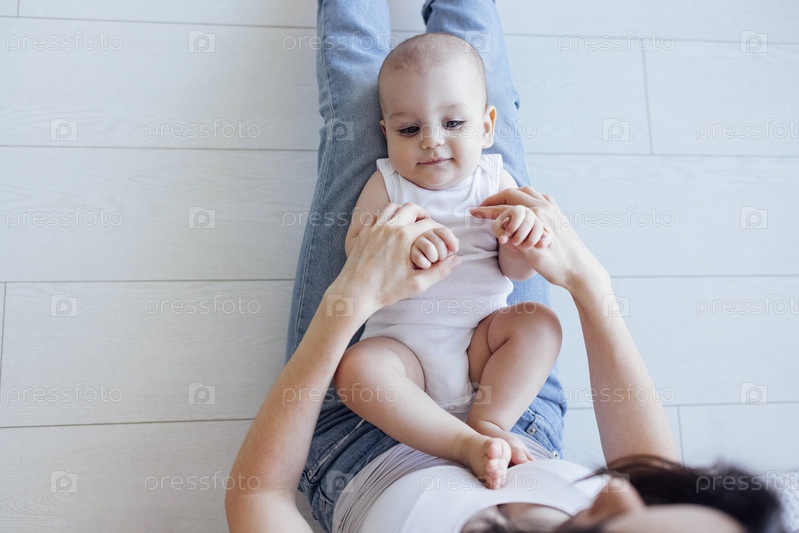 Симпатичный младенец в белом боди со своей мамой на светлом фоне