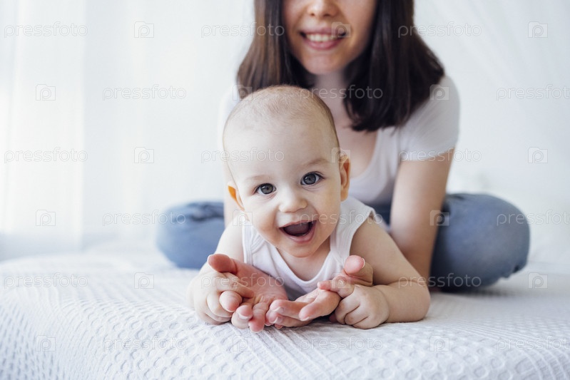 Симпатичный младенец в белом боди со своей мамой на светлом фоне. Концепция материнства