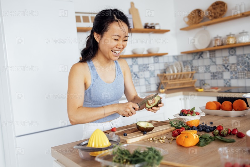 Привлекательная милая азиатка улыбается и готовит завтрак на кухне. Молодая очаровательная кореянка смеется и режет овощи и рыбу. Здоровая пища. Уютный современный интерьер комнаты