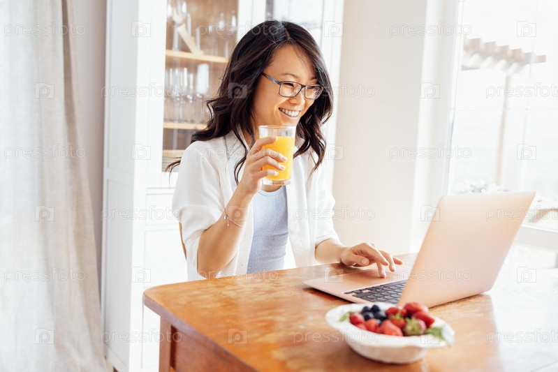 Улыбающийся азиатский фрилансер в очках и повседневной одежде работает за ноутбуком и пьет апельсиновый сок. Молодая девушка учится удаленно в столовой дома