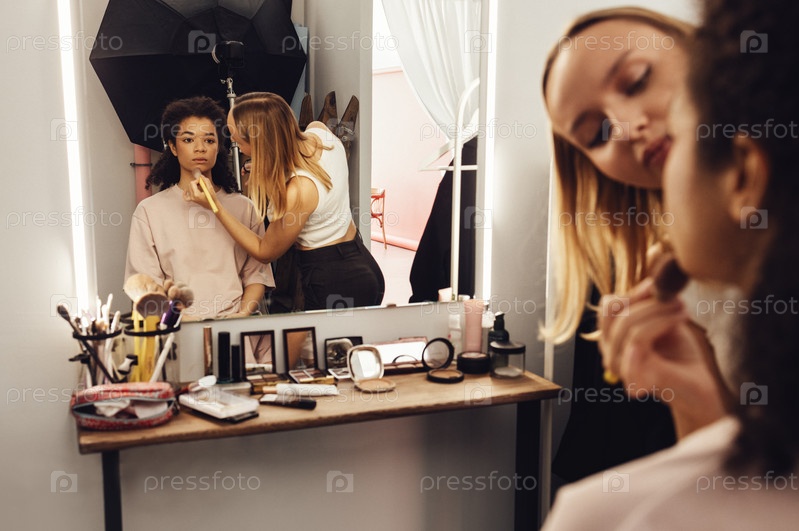Европейский молодой профессиональный визажист наносит тональный крем на кожу клиентки