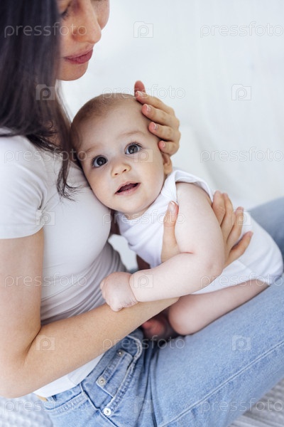 Симпатичный младенец в белом боди со своей мамой на светлом фоне. Концепция материнства