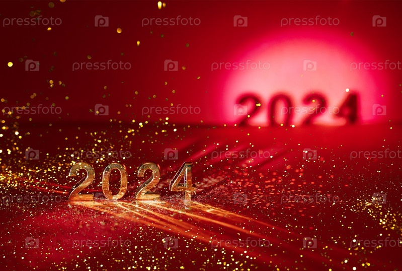Цифры 2024 золотого цвета и сверкающие конфетти на ярко-красном фоне. Новогодняя композиция. Текстовый фон. Стратегия нового года и бизнес-концепции