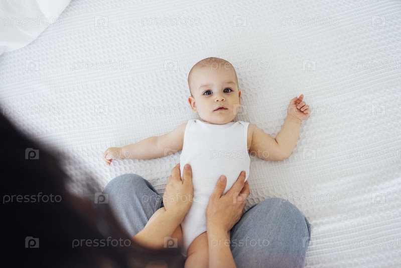 Симпатичный младенец в белом боди со своей мамой на светлом фоне. Концепция материнства