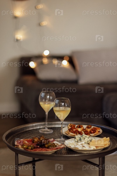 Два бокала прохладного шампанского и тарелки с различными закусками на круглом металлическом журнальном столике