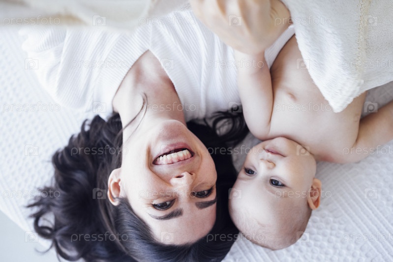 Симпатичный младенец в белом боди со своей мамой на светлом фоне