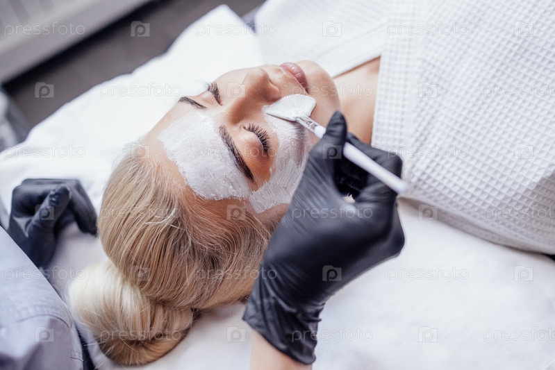 Косметолог наносит омолаживающую белую маску на лицо клиентки