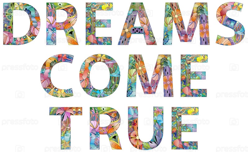 Иллюстрирующие слова DREAMS COME TRUE, окрашенные в теплые цвета для дизайна футболок, татуировок и других украшений