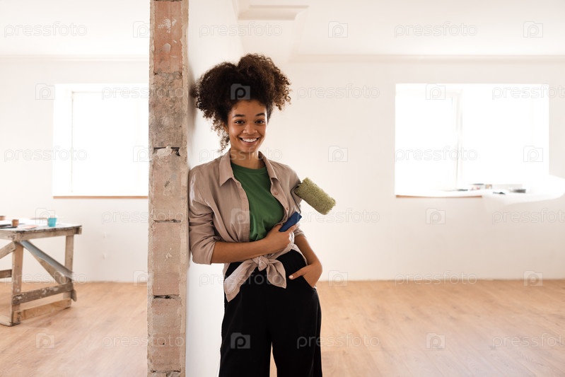 Молодая привлекательная афроамериканка в повседневной одежде стоит и улыбается малярным валиком. Красим стены