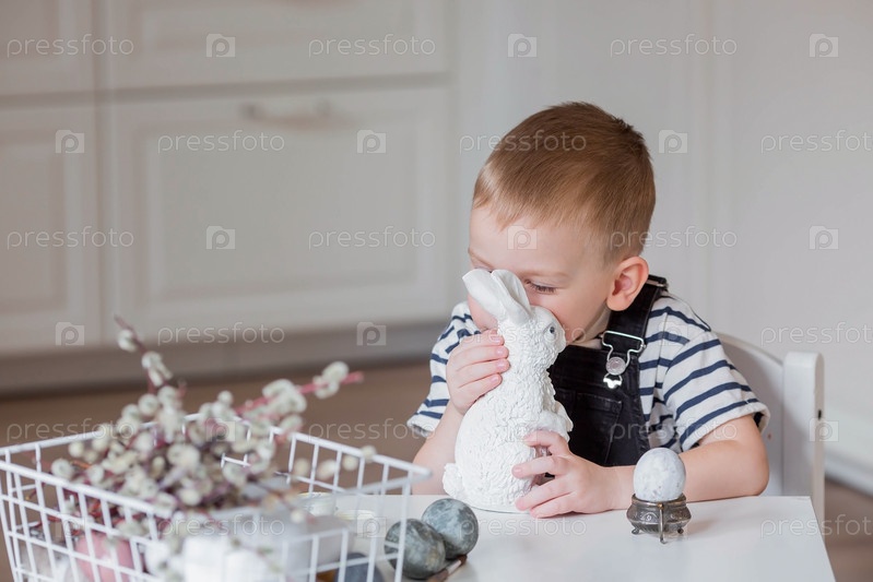 Маленький мальчик и белый пасхальный кролик. Готовим семью к Светлой Пасхе. Ребенок играет с яйцами