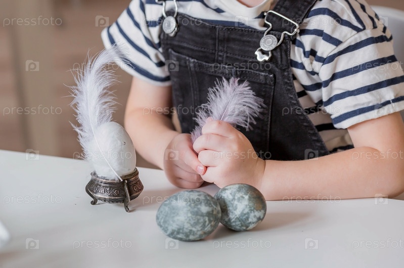 Маленький мальчик красит яйца в Чистый четверг к празднику. Готовим семью к Светлой Пасхе. В руках ребенка кисточка и яйцо