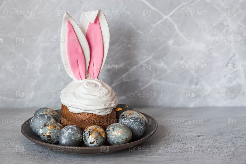 Красивый стильный натюрморт. Пасхальный кулич с кроличьими (заячьими) ушками, безе, зефиром, пасхальными яйцами и ветвями ивы и на светлом бетонном фоне. С Пасхой 2024