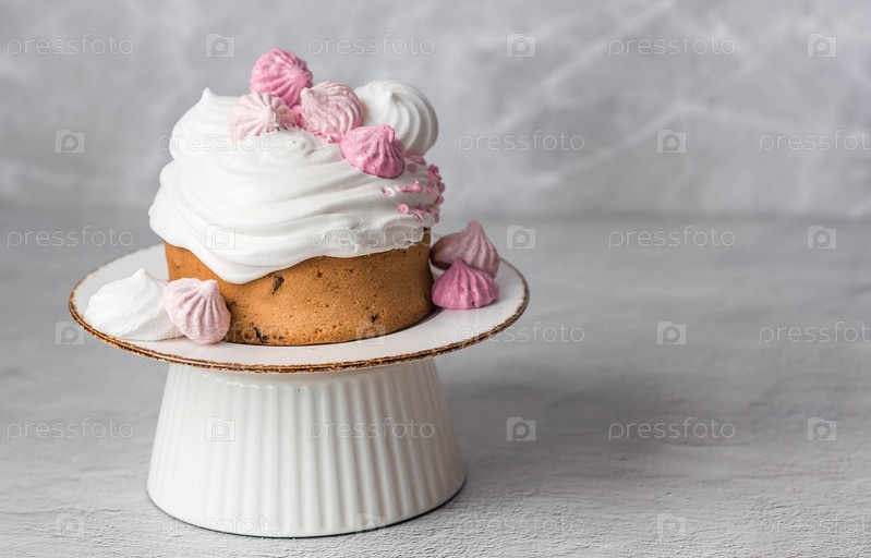 Красивый стильный натюрморт. Пасхальный кулич с безе, зефиром, пасхальными яйцами и веточками ивы на светлом бетонном фоне. счастливой Пасхи 2024