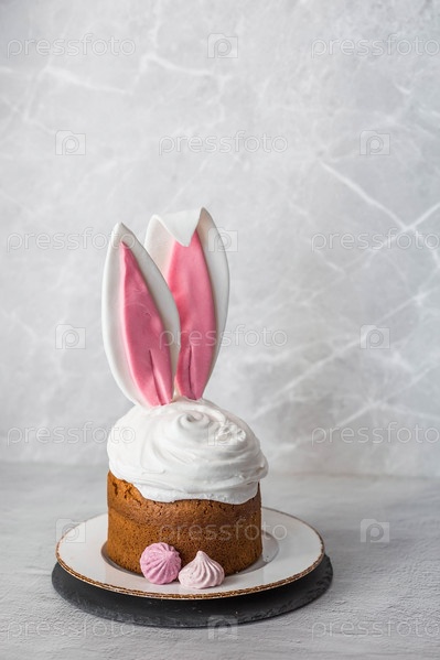 Красивый стильный натюрморт. Пасхальный кулич с кроличьими (заячьими) ушками, безе, зефиром, пасхальными яйцами и ветвями ивы и на светлом бетонном фоне. С Пасхой 2024