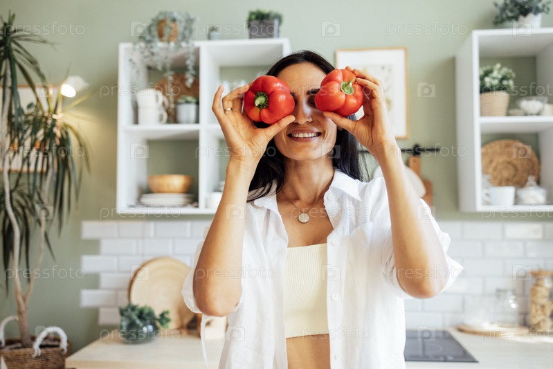 Очаровательная молодая женщина балуется и держит перед лицом красный перец утром на кухне. Привлекательная брюнетка смеется и любит готовить дома