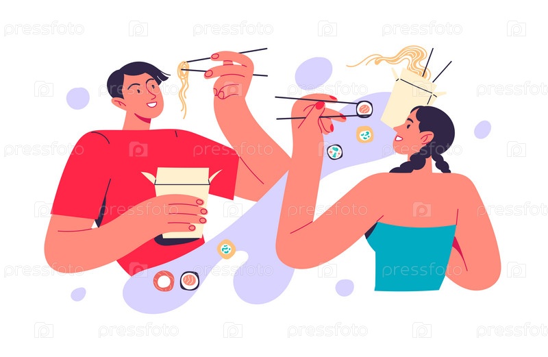 Два человека едят вок и роллы