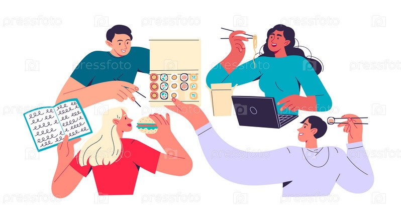 Группа студентов учится и ест