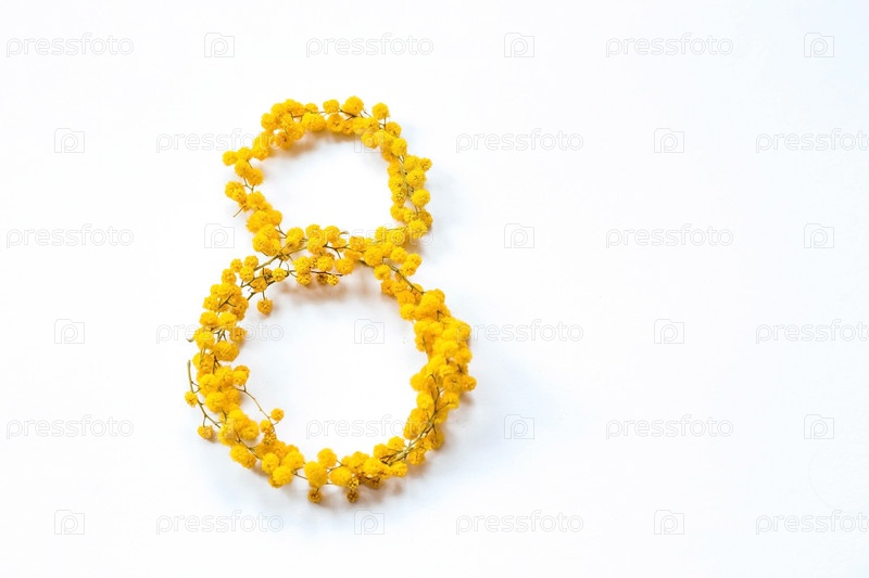 Международный женский день. Баннер, флаер, красивая открытка к 8 марта. Желтые цветы мимозы в форме цифры восемь на белом изолированном фоне