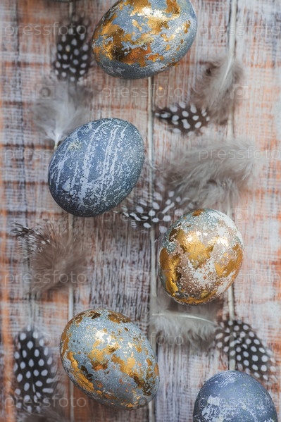 С Пасхой 2024. Стильные серые пасхальные яйца цвета мрамора, бетона, золота и красивых перьев на деревянном фоне. Окраска яиц натуральным красителем чай каркаде. Экологичность. Естественность