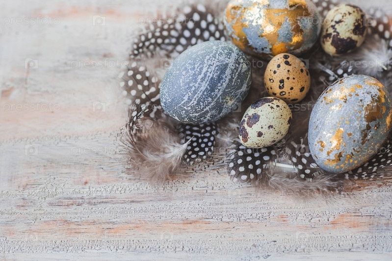 С Пасхой 2024. Стильные серые пасхальные яйца цвета мрамора, бетона, золота и красивых перьев на деревянном фоне. Окраска яиц натуральным красителем чай каркаде. Экологичность. Естественность