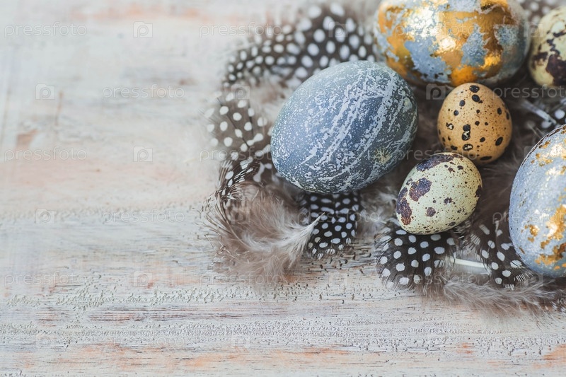 С Пасхой 2024. Стильные серые пасхальные яйца цвета мрамора, бетона, золота и красивых перьев на деревянном фоне. Окраска яиц натуральным красителем чай каркаде. Экологичность. Естественность