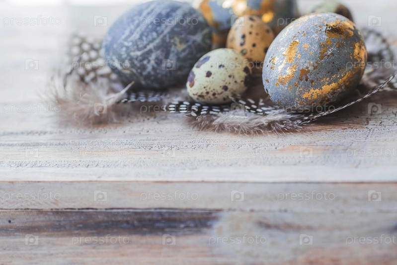 С Пасхой 2024. Стильные серые пасхальные яйца цвета мрамора, бетона, золота и красивых перьев на деревянном фоне. Окраска яиц натуральным красителем чай каркаде. Экологичность. Естественность