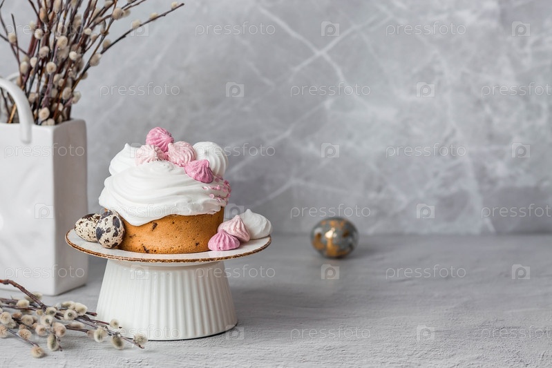 Красивый стильный натюрморт. Пасхальный кулич с безе, зефиром, пасхальными яйцами и веточками ивы на светлом бетонном фоне. счастливой Пасхи 2024