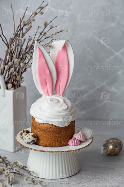 Красивый стильный натюрморт. Пасхальный кулич с кроличьими (заячьими) ушками, безе, зефиром, пасхальными яйцами и ветвями ивы и на светлом бетонном фоне. С Пасхой 2024