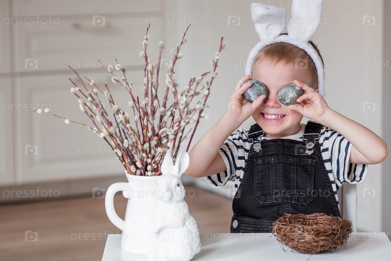 Портрет маленького мальчика с кроличьими ушками на голове и пасхальными яйцами в руках. Подготовка семьи к Пасхе. Улыбающееся лицо ребенка
