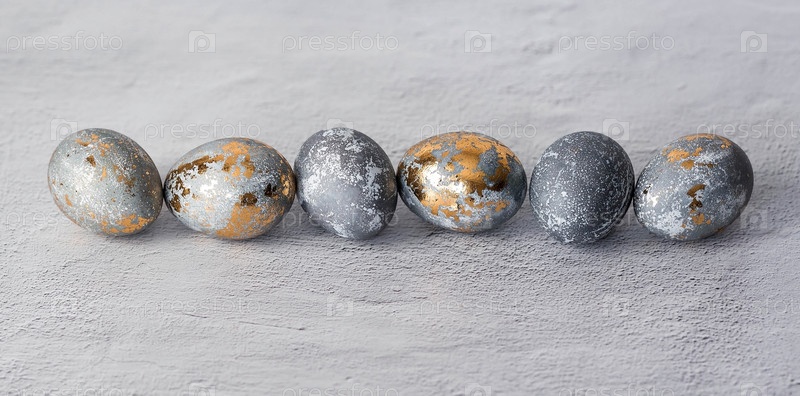 Стильные серые пасхальные яйца из мрамора и бетона с золотой поталой на сером фоне. Окраска яиц натуральным красителем чай каркаде. Экологичность. Естественность. Концепция счастливой Пасхи