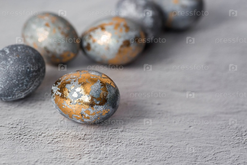Стильные серые пасхальные яйца из мрамора и бетона с золотой поталой на сером фоне. Окраска яиц натуральным красителем чай каркаде. Экологичность. Естественность. Концепция счастливой Пасхи