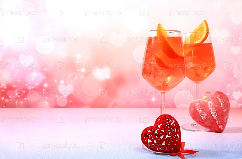 Праздничный алкогольный коктейль Aperol spritz в стаканах и любовных сердцах, концепция Дня святого Валентина, спиртные напитки на вечеринках, реклама баров и ресторанов,
