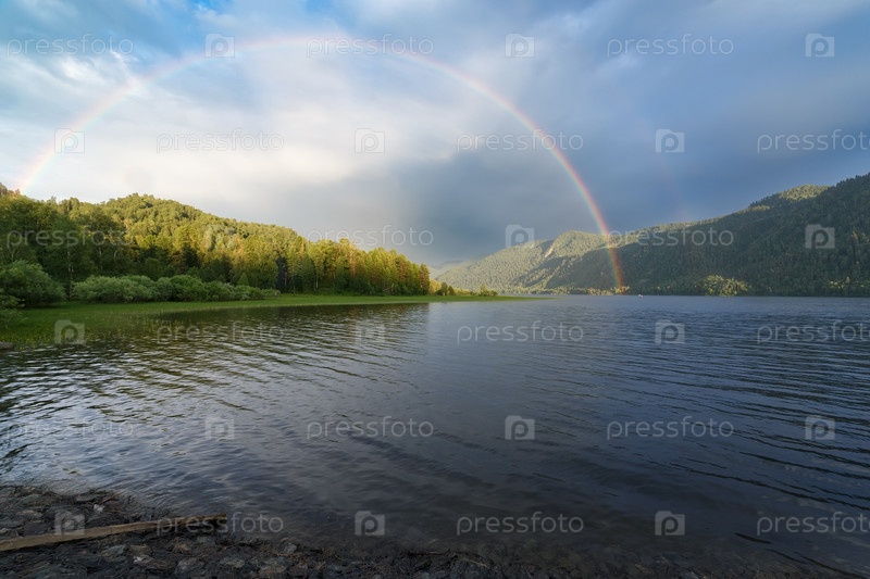 Радуга над Телецким озером в ненастную погоду, Россия, Горный Алтай