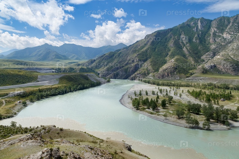 Слияние рек Катунь и Чую в Республике Алтай, Россия, в начале лета