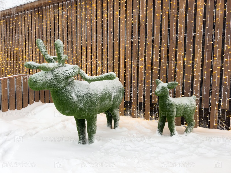 Зеленый декоративный олень зимой на улице