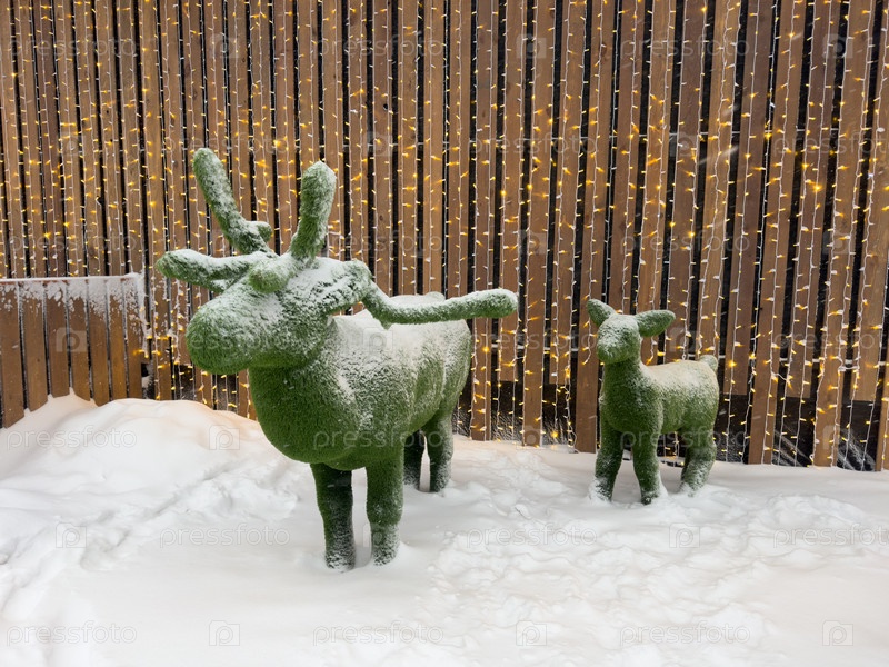 Зеленый декоративный олень зимой на улице
