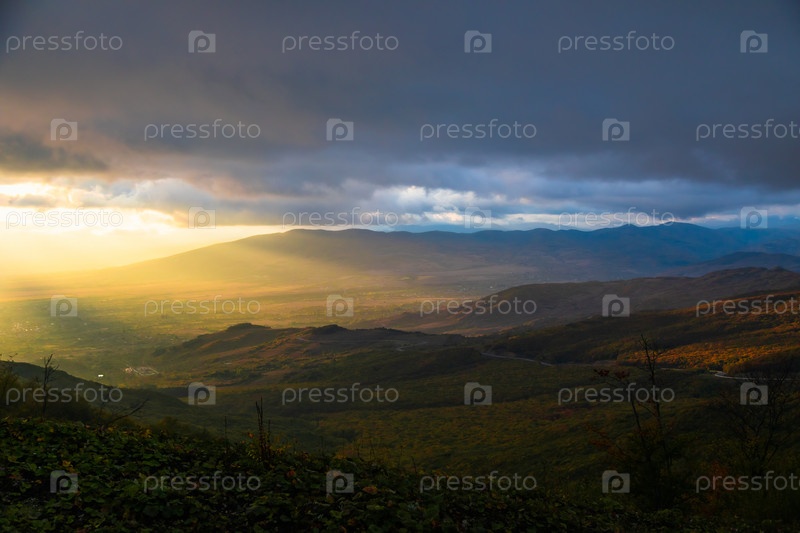 Яркое закатное небо отражается в горных вершинах, окружая природу мягким светом и наполняя ее теплом