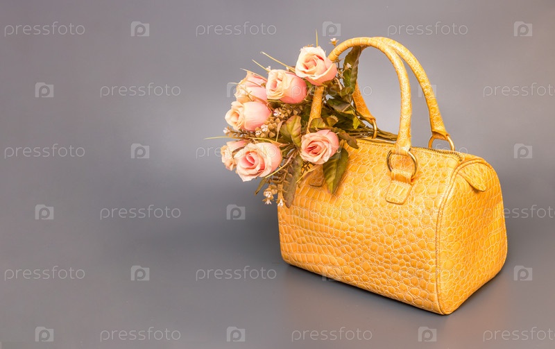 Желтая кожаная сумочка с букетом роз на сером фоне