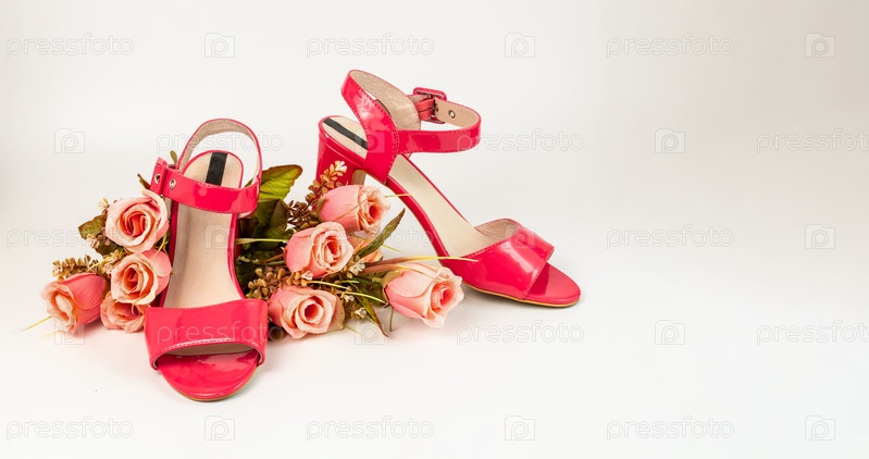 Розовый летние туфли в букетом роз на белом фоне