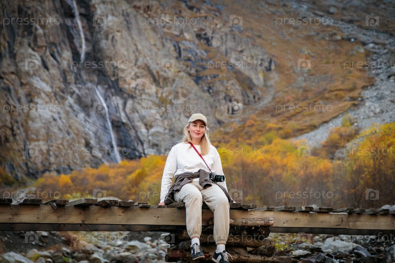 Момент одиночества, девушка на мосту у водопада в горах